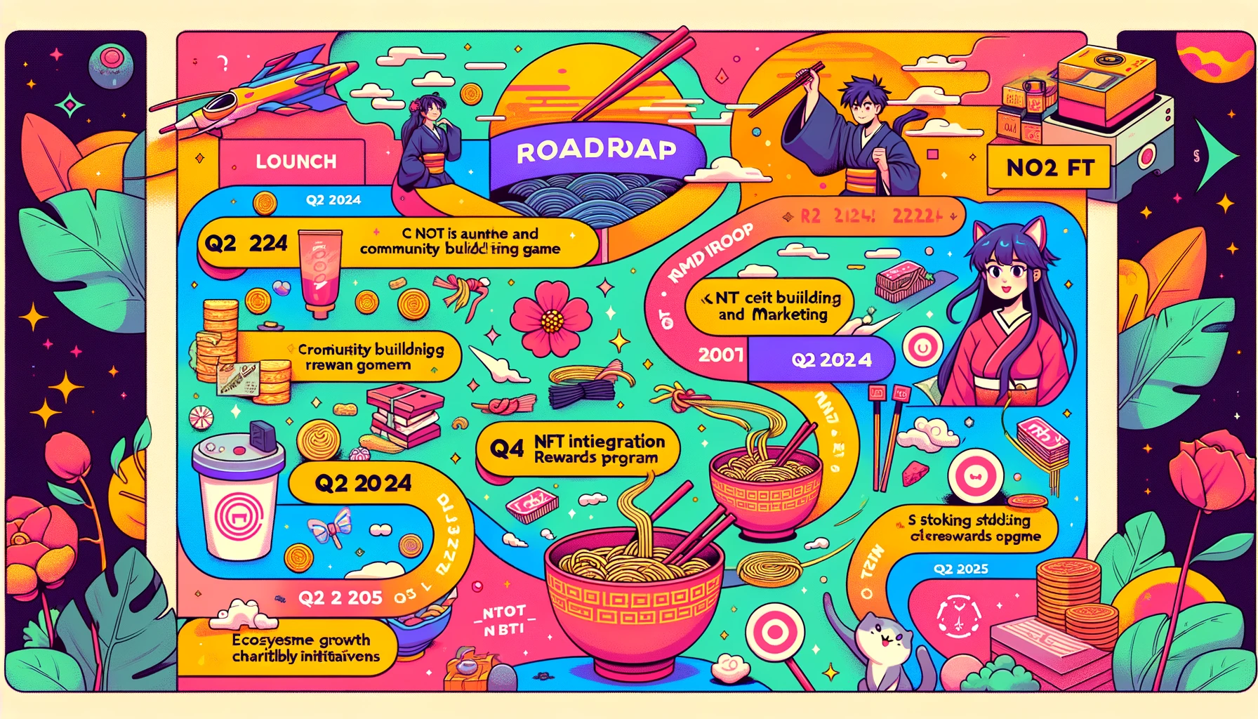 Ramen Riches has a well-defined roadmap with milestones from launch to ecosystem growth, ensuring continuous development and strategic expansion.